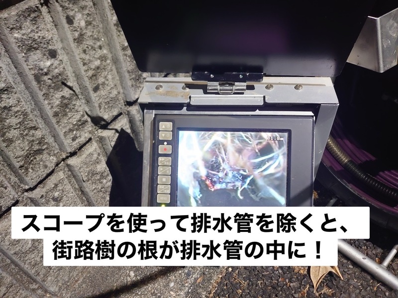 公道の街路樹の根が配管を突き破り、その根に、物が詰まっていました。
